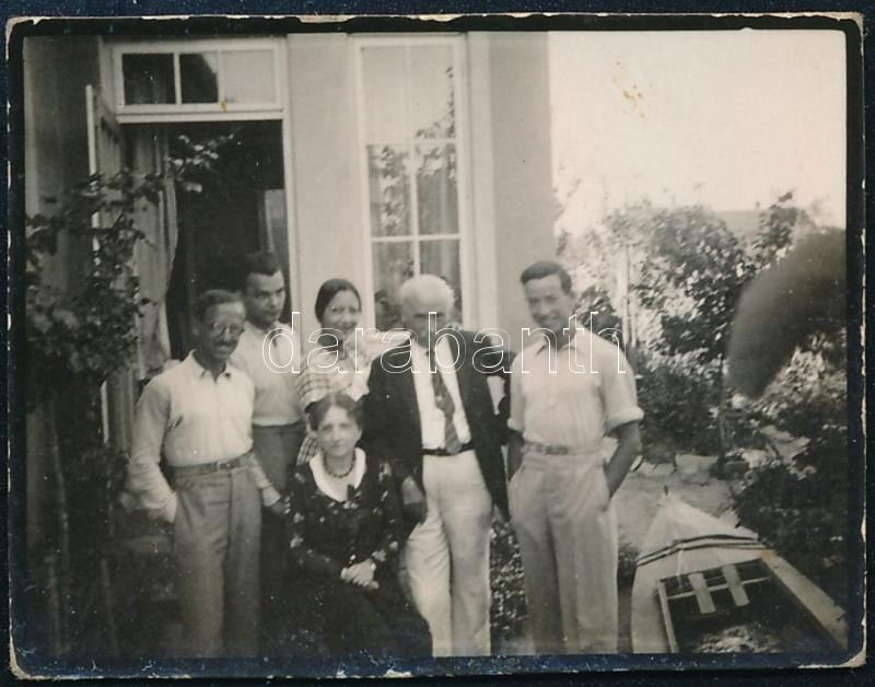 cca 1935-36 Keresztury Dezső író, költő, későbbi politikus és a Seiber család tagjai: Seiber Mátyás zeneszerző, tanár, Keresztury Dezsőné Seiber Mária zongoraművész, zenetanár, Seiberné Patay Berta zongoraművésznő, zenetanárnő és a család további két tagja, Balatonboglár, hátoldalán datált vintage fotó. 3x4 cm