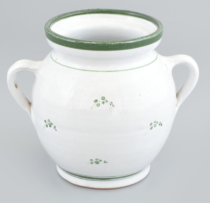 Apró zöld mintás csupor, kézzel festett, jelzett kerámia, kis kopásnyomokkal, m: 13 cm