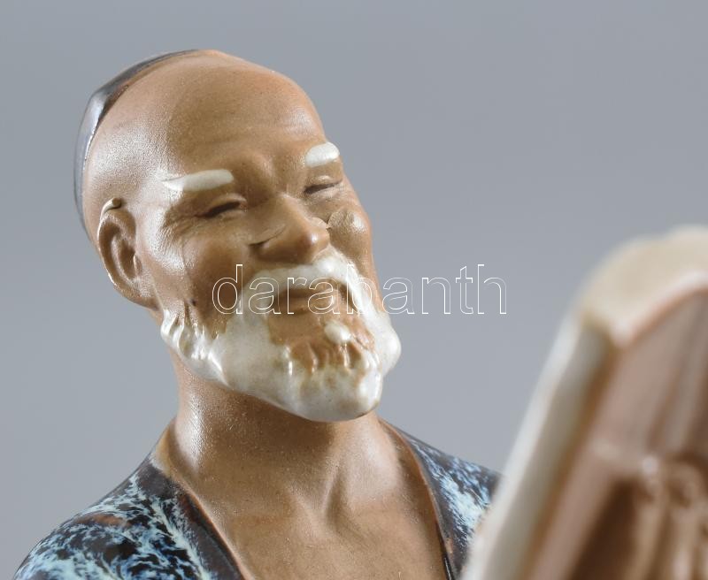 Kínai olvasó bölcs, mázas kerámia figura, jelzett, kis hiánnyal, m: 14...