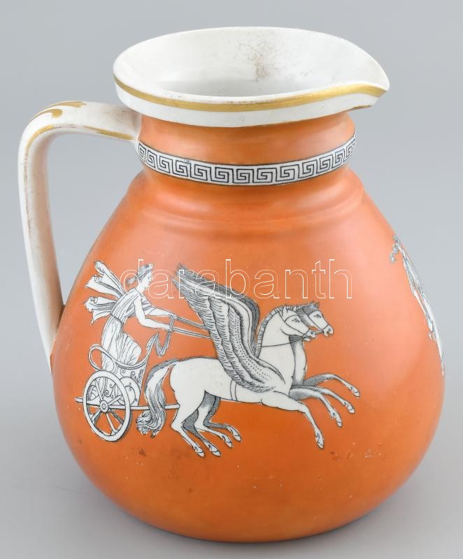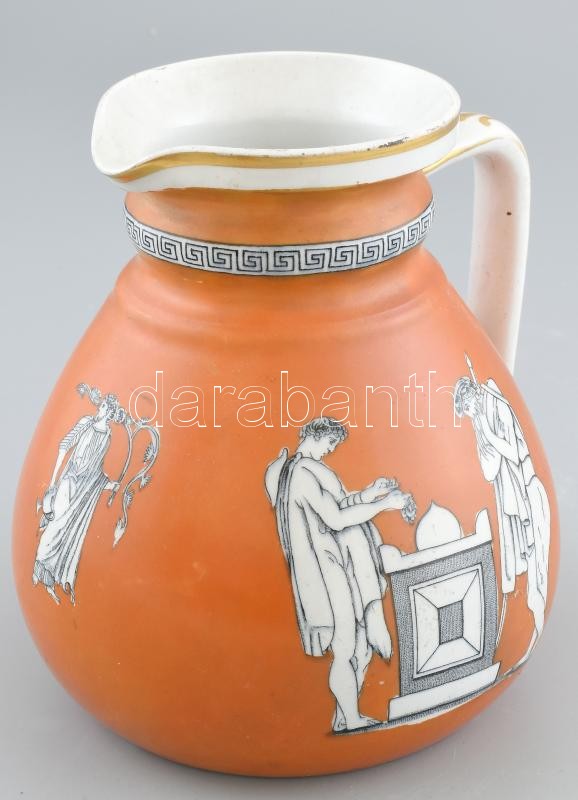 Antik fajansz kancsó görög jelenetekkel, jelzés nélkül, mázrepedésekkel, kis kopásokkal, m: 16 cm