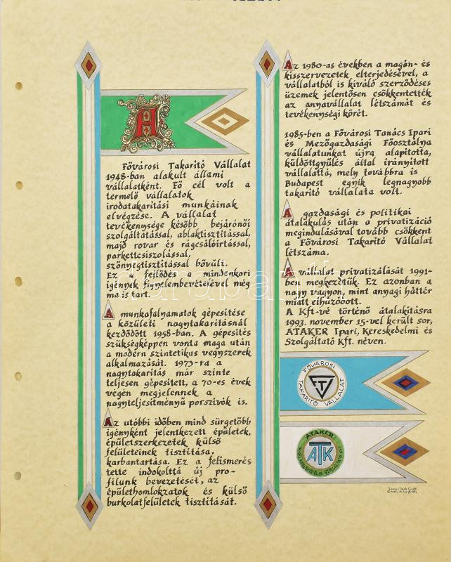 1994 Fővárosi Takarító Vállalat, kézzel festett, cégismertető reklámterv, lap széle lyukasztott, 47×38 cm