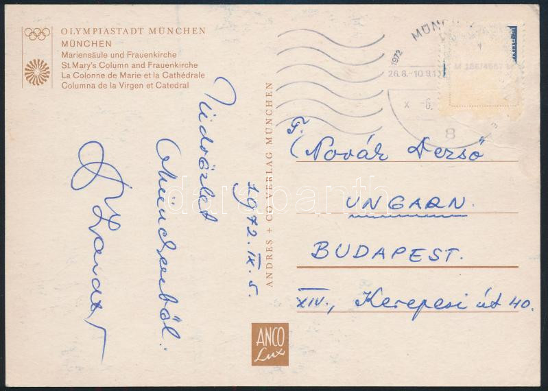 Description: 1972 München, Lakat Károly (1920-1988) ferencvárosi válogatott labdarúgó, mesteredző, olimpiai válogatott szövetségi kapitány (1963-1972) saját kézzel írt levele Novák Dezső (1939-2014) ferencvárosi kétszeres olimpiai bajnok válogatott labdarúgó, edző részére, az olimpia helyszínről haza küldött képeslap.