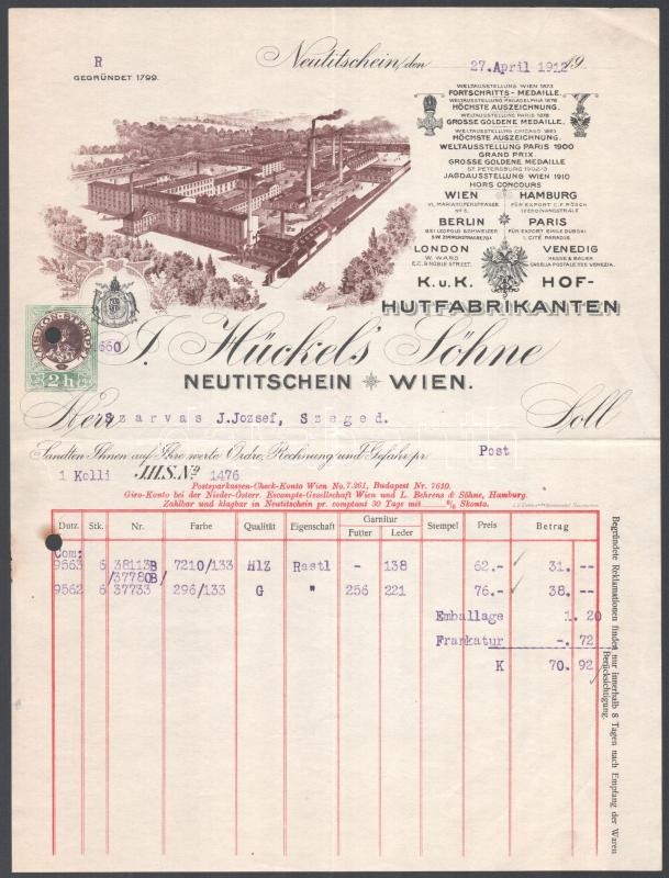 1912 Neutitschein - Wien, J. Hückel's Söhne K. u. K. Hof- Hutfabrikanten, udvari kalapgyártó fejléces számlája