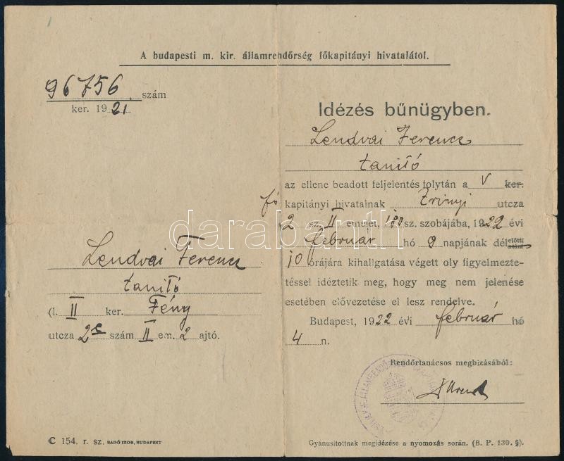 https://www.darabanth.com/en/429-Online-auction/429.0/Art-and-other-collectibles/Documents~500019/1922-Bp-a-Budapesti-M-Kir-Allamrendorseg-Fokapitanyi-Hivatalanak-idezese-bunugyben~II2733130