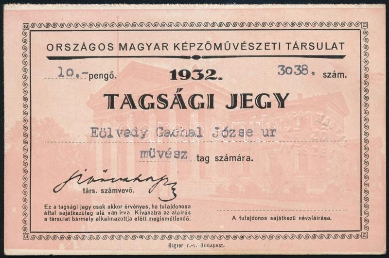 1932 Eölvedi Gachal József (1889-1972) festőművész tagsági jegye Magya...