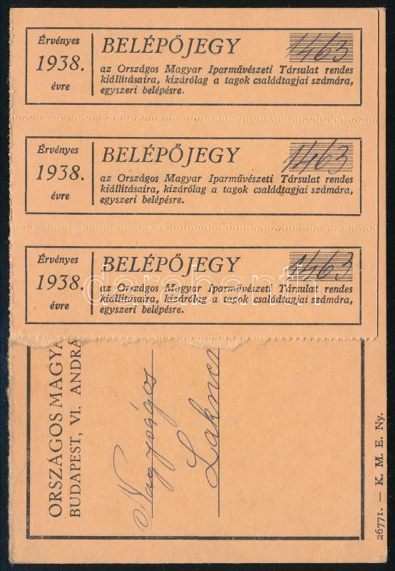 1938 Az Országos Magyar Iparművészeti Társulat tagsági jegye, 3 db belépőjeggyel