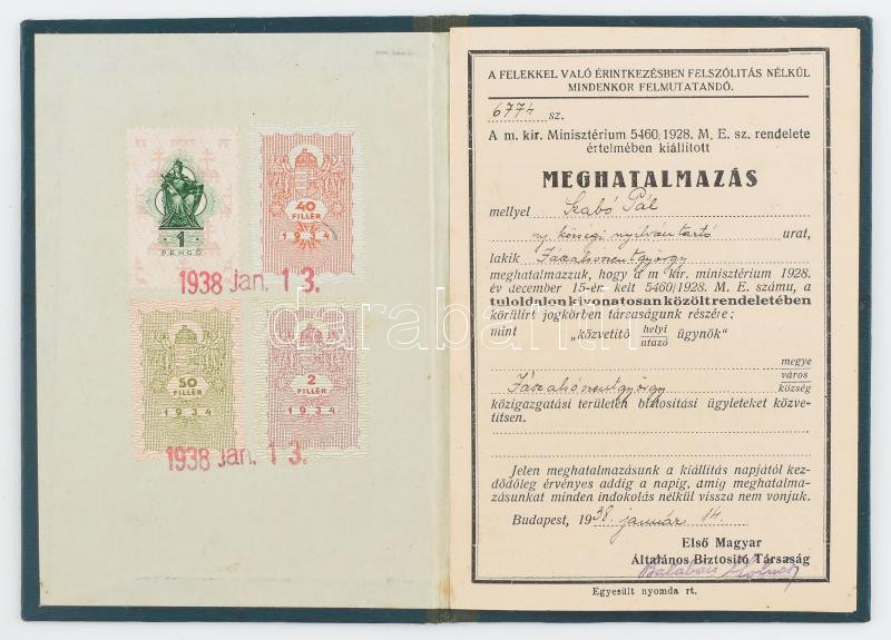 1938 Első Magyar Általános Biztosító Társaság igazolvány (meghatalmazá... https://www.darabanth.com/en/429-Online-auction/429.0/Art-and-other-collectibles/Documents~500019/1938-Elso-Magyar-Altalanos-Biztosito-Tarsasag-igazolvany-meghatalmazas-kepviselojenek-~II2756142