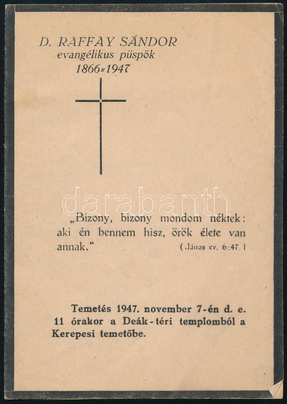 1947 Raffay Sándor (1866-1947) evangélikus püspök, felsőházi tag, teológus, költő-író-műfordító halotti értesítője, benne a temetés rendjével