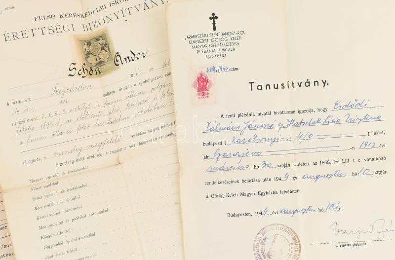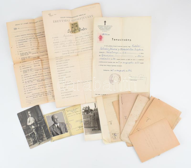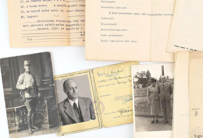 Description: cca 1860-1945 Schön Andor (1883-?) papírhagyatéka: fotók (katonaportré), Kőbányai Polgári Serfőzde és Szent István Tápszerművek Rt. fényképes igazolvány (cégvezető), hivatalos iratok, köztük izraelita vonatkozásúak (anyakönyvi kivonatok, áttérési igazolás, stb.), összesen 15 db.
