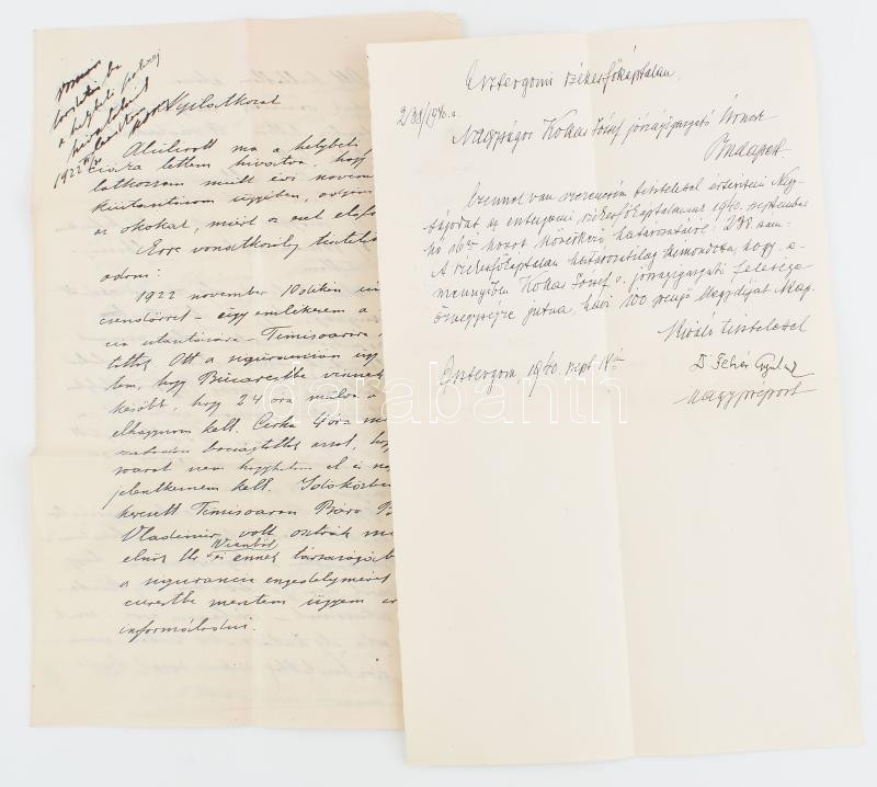 1922 Comlos (Nagykomlós / Comlosu Mare), Kokas Ignác, San Marco hercegné jószágigazgatójának ellene felhozott vádakkal kapcsolatban írt hivatalos nyilatkozata, amelyben a vádakat "szemen szedett hazugság"-nak nevezi, és ügye újbóli kivizsgálását kérvényezi. + 1940 Esztergom, az esztergomi székesfőkáptalan levele Kokas József jószágigazgató részére, felesége özvegységre jutása esetén folyósítandó havi járadék megállapításáról.