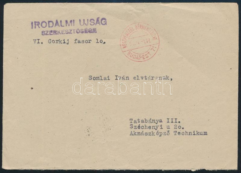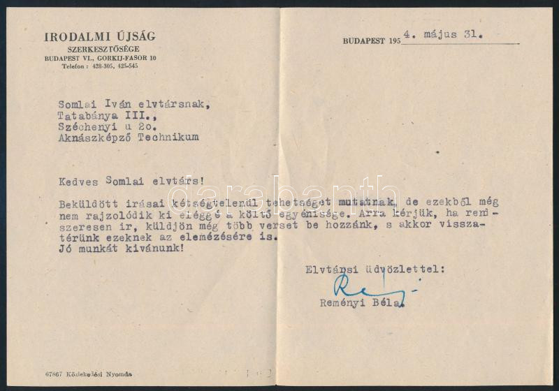 1954 Reményi Béla (1914-1962) költő, az Irodalmi Újság szerkesztője saját kézzel aláírt véleménye beküldött versekről eredeti borítékjában, szép állapotban