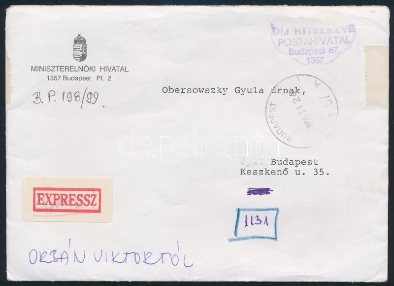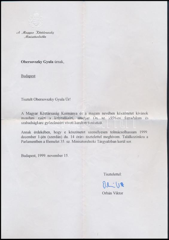 1999 Orbán Viktor (1963-) miniszterelnök levele Obersovszky Gyula (192... https://www.darabanth.com/en/429-Online-auction/429.0/Art-and-other-collectibles/Historical-documents-manuscripts~500020/1999-Orban-Viktor-1963-miniszterelnok-levele-Obersovszky-Gyula-1927-2001-1956-os-forradalmar~II2751465