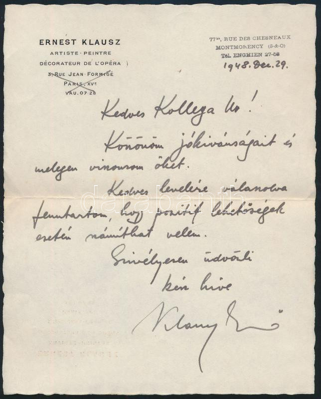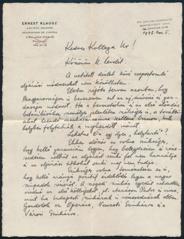 Klausz Ernő / Ernest Klausz (1894 - 1970) festő, díszlettervező két autográf levele, az egyik azáltala alkalmazott vetített díszletes lejárás magyarországi bevezetéséről.