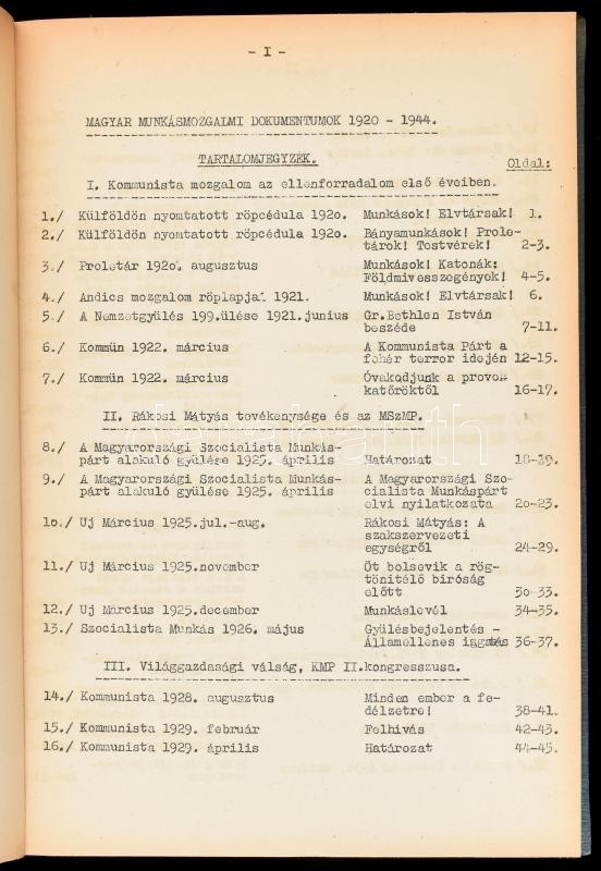 Magyar munkásmozgalmi dokumentumok 1920-1944. Kézirat gyanánt. Sokszorosított gépirat, IV+210+(1) p. Félvászon-kötésben.