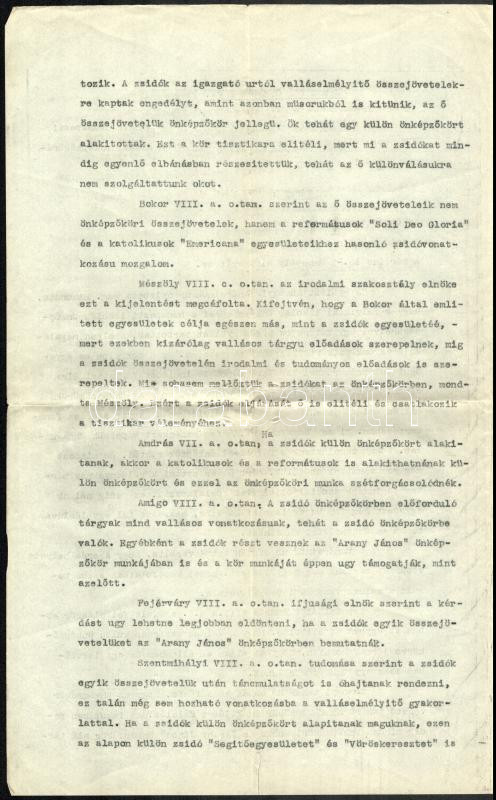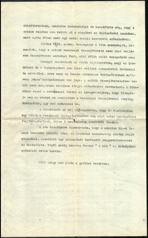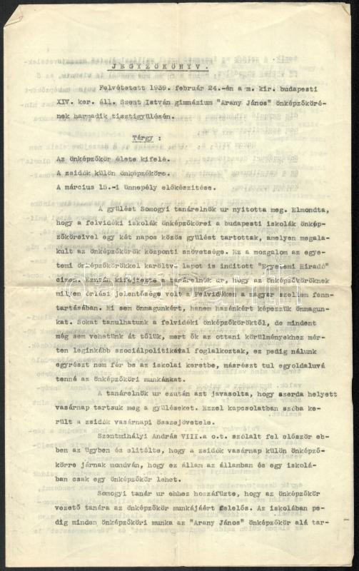 1939 Jegyzőkönyv az "Arany János" önképzőkör (zsidók külön ö...