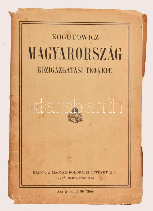 Description: cca 1942 Magyarország közigazgatási térképe, az 1942. évi határokkal. Tervezte és rajzolta: Kogutowicz Manó. 1 : 900.000. Bp., Magyar Földrajzi Intézet Rt. Sérült, kissé foltos borítóval, szakadásokkal, 115x84 cm