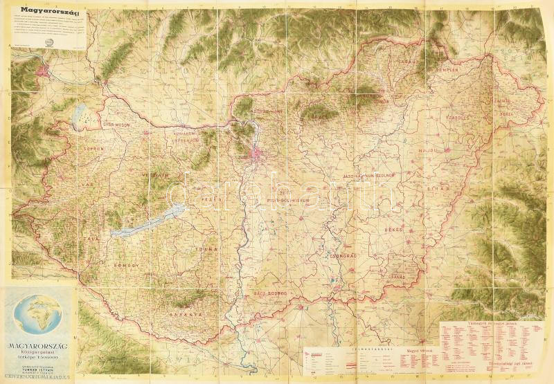 Description: cca 1948 Magyarország közigazgatási térképe. Szerk. és kiadja: Turner István. 1 : 500.000. Bp., Klösz Gy. és Fia, vászonra kasírozva, kissé sérült szélekkel, 108x80 cm