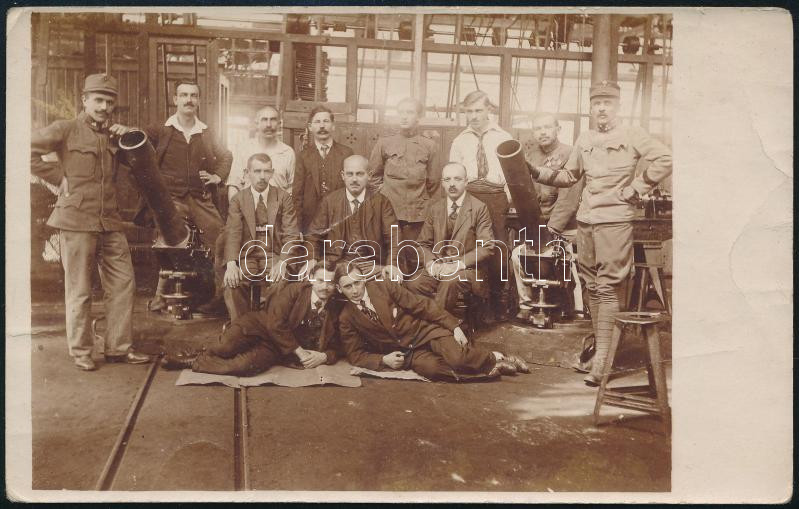 cca 1914-1918 I. világháborús hadiüzem, magyar katonák és munkások ágyúkkal, fotólap, kisebb törésnyomokkal, 13,5x8,5 cm