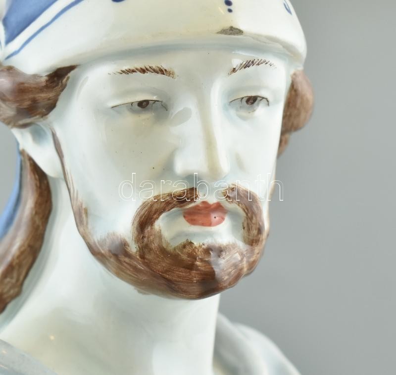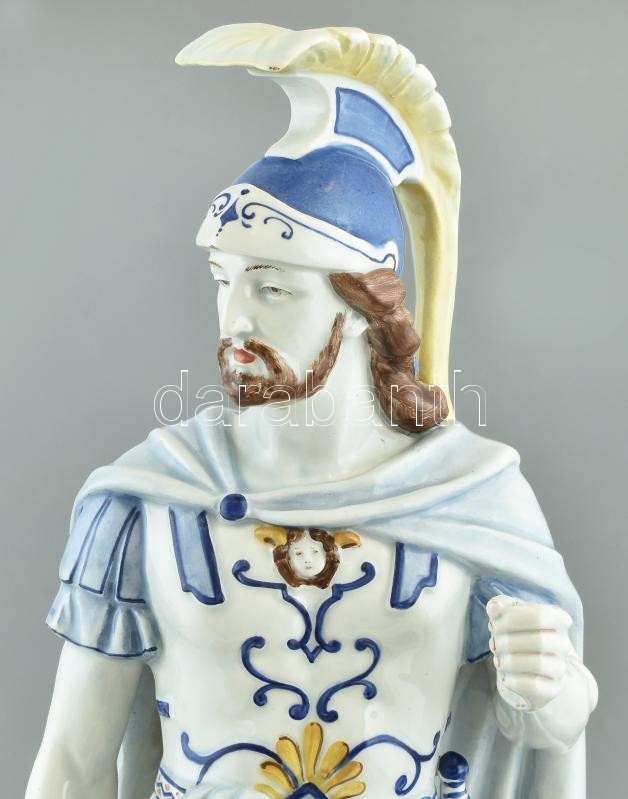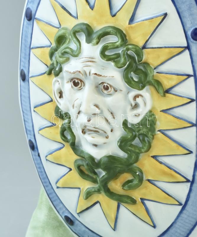 Hellén katona, Meduzafejes pajzzsal, színesen, kézzel festett fajansz, 1900 körül, Olaszország, formaszám: 12191, apró kopásokkal, m:50cm
