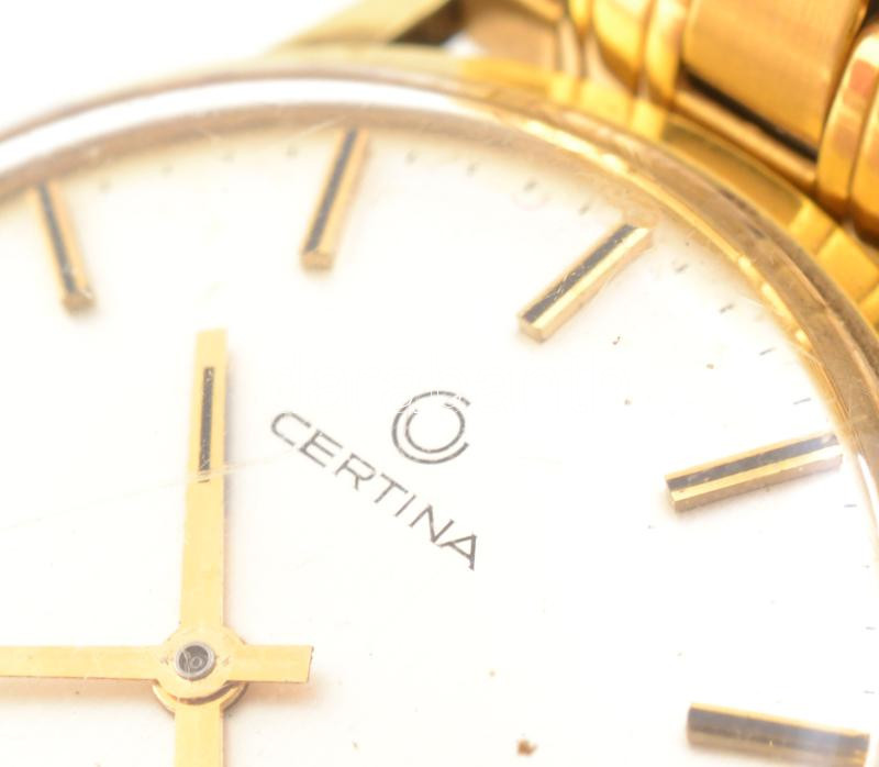 Certina karóra, sorszámozott tokkal, aranyozott fém szíjjal, az üvegen...