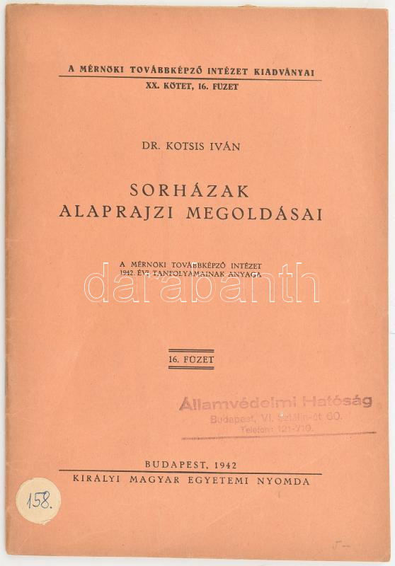 Description: Kotsis Iván: Sorházak alaprajzi megoldásai. Mérnöki Továbbképző Intézet kiadványai XX. köt. 16. füzet. Bp., 1942., Kir. M. Egyetemi Nyomda, 40 p. Kiadói papírkötés. "Államvédelmi Hatóság, Bp., VI. Sztálin-út 60.[Andrássy út 60.]" bélyegzéssel.