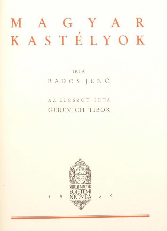 Magyarország Művészeti Emlékei, 3 kötet: I. köt.: Gerevich Tibor: Magyarország románkori emlékei. II. köt.: Horváth Henrik: Budapest művészeti emlékei. IV. köt.: Rados Jenő: Magyar kastélyok. Gerevich Tibor előszavával. Szerk.: Gerevich Tibor. Bp., 1938-1939, Kir. M. Egyetemi Nyomda. Fekete-fehér képekkel gazdagon illusztrálva. Kiadói félbőr-kötés, sérült borítókkal, belül nagyrészt jó állapotban, néhány kissé koszos és néhány kijáró lappal, ex libris bélyegzőkkel.