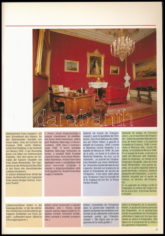 Description: Richard H. Kastner: A bécsi császári palota. Die Hofburg in Wien. Bécs, 1989, Bécsi várkapitányság (Burghauptmannschaft in Wien), 55 p. Gazdag színes képanyaggal illusztrálva, a végén kihajtható alaprajzzal/térképpel. Négy nyelven (magyar, német, francia, spanyol). Kiadói tűzött papírkötés.
