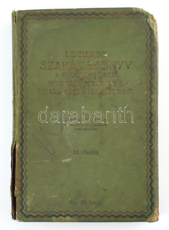 Podruzsik Béla: Legújabb szakácskönyv. A polgári konyha, házi cukrászat és a diétás főzés ismereteivel. III. kiadás. Bp., 1930, Otthon Nyomda, 352 p. Kiadói egészvászon-kötésben, sérült gerinccel és borítóval, az első és hátsó kötéstábla belsején jegyzetekkel, lapok jobb felső sarka sérült és hiányos, megviselt állapotban.