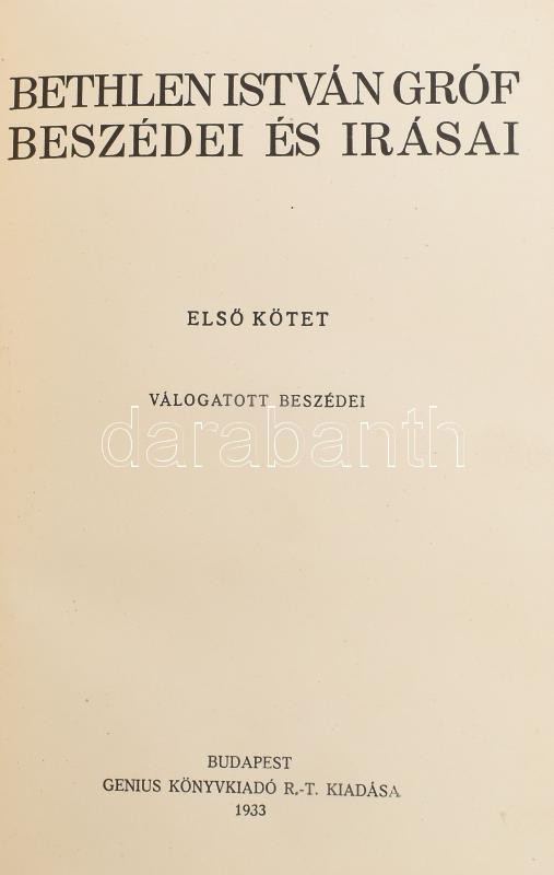 Bethlen István gróf beszédei és írásai. Válogatott beszédei. I-II. köt... https://www.darabanth.com/en/429-Online-auction/429.0/Books/Books-History~1000008/Bethlen-Istvan-grof-beszedei-es-irasai-Valogatott-beszedei-I-II-kotet-Bp-1933-Genius-~II2721343