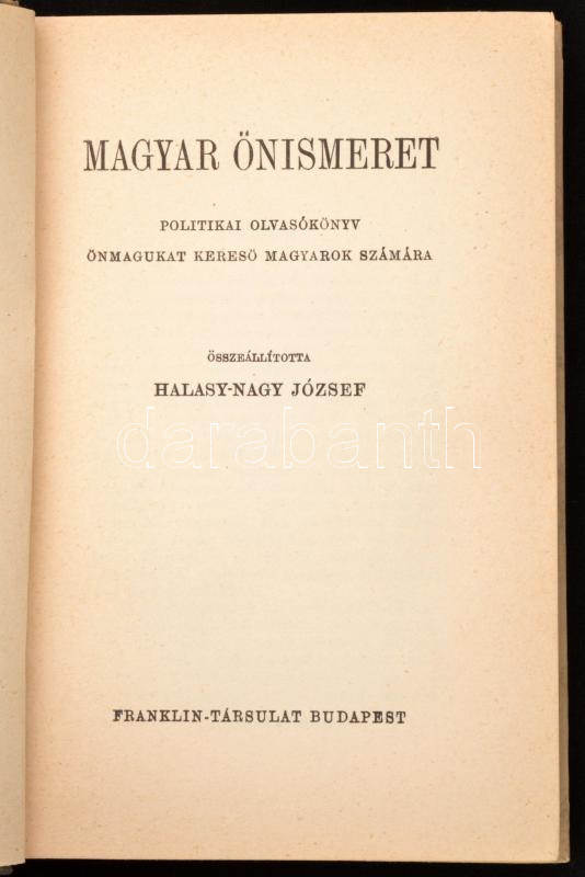 Halasy-Nagy József: Magyar önismeret. Politikai olvasókönyv önmagukat ... https://www.darabanth.com/en/429-Online-auction/429.0/Books/Books-History~1000008/Halasy-Nagy-Jozsef-Magyar-onismeret-Politikai-olvasokonyv-onmagukat-kereso-magyarok-szamar~II2748769