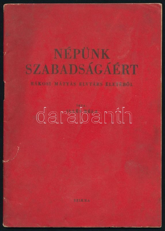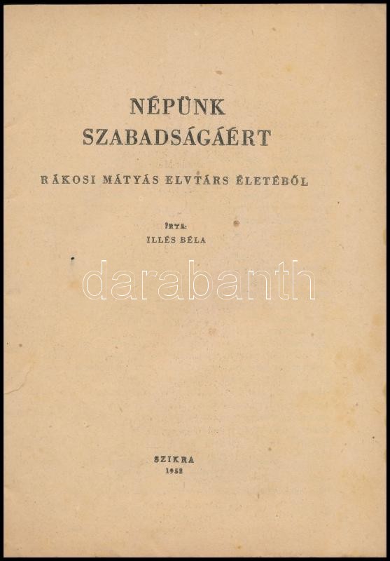 Illés Béla: Népünk szabadságáért. Rákosi Mátyás elvtárs életéből. Bp., 1952, Szikra, 48 p. + 8 t. Fekete-fehér fotókkal illusztrált. Kiadói tűzött papírkötés, foltos, kisebb szakadással.