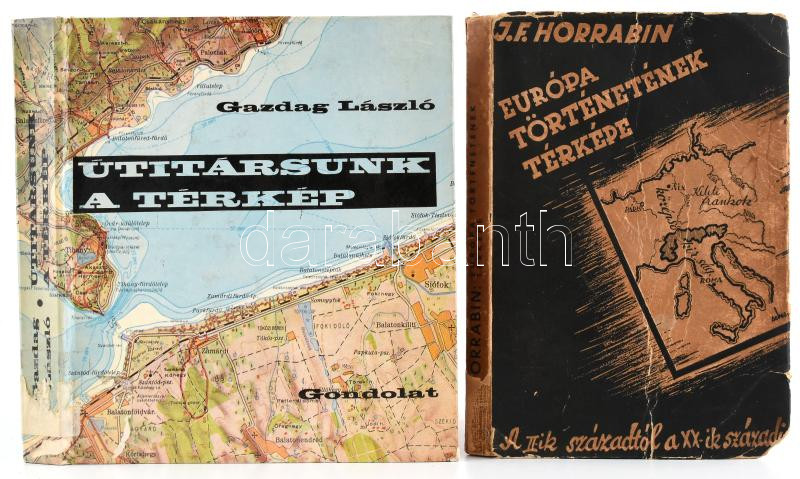J. F. Horrabin: Európa történetének térképe. A II.ik századtól a XX-ik századig. Fordította: Tamás Aladár. Bp., 1936, Faust Imre,159 p. Kiadói papírkötés,foltos, kopott borítóval, az elülső borító törésnyommal, az egyik sarkán kis hiánnyal. +G azdag László: Útitársunk a térkép. Bp., 1969, Gondolat. 350 p. Fekete-fehér képekkel illusztrált. Kiadói kartonált papírkötés.