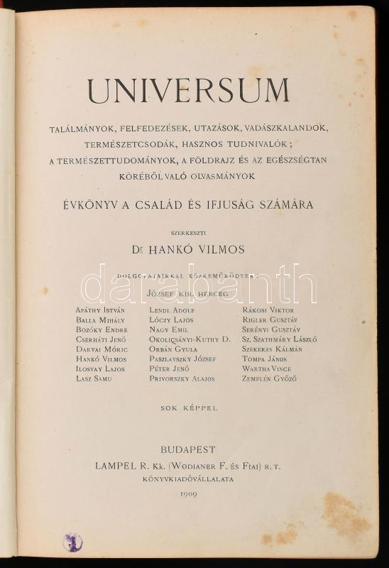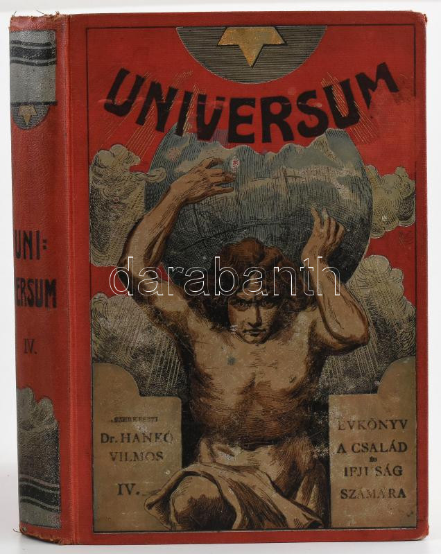 Universum: Évkönyv a család és az ifjúság számára. IV. kötete. Vadász és útleírásokkal, és többek között a tátrai életről, Balatonról szóló résszel is. Szerk. Dr. Hankó Vilmos. Bp.,1909, Lampel R. (Wodianer F. és Fiai Rt.), IV+384 p. Kiadói festett, illusztrált, egészvászon-kötésben, kissé kopott borítóval.