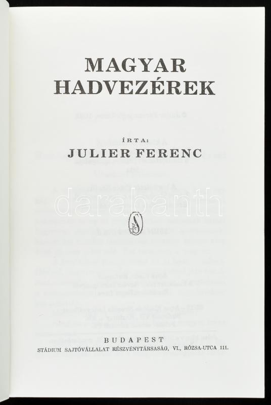Julier Ferenc: Magyar hadvezérek. Bp., 1992, Stádium Sajtóvállalat Rt. Kiadói papírkötés