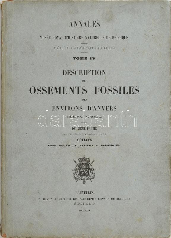 Description: Beneden, [Pierre-Joseph] van: Description des ossements fossiles des environs d'Anvers. Annales du Musée Royal d'Histoire Naturelle de la Belgique - Série Paléontologique Tome IV. Bruxelles, 1880, F. Hayez, 81 p. Francia nyelven. Kiadói nagyalakú papírkötés, kissé sérült borítóval és gerinccel, kissé foltos lapokkal.
