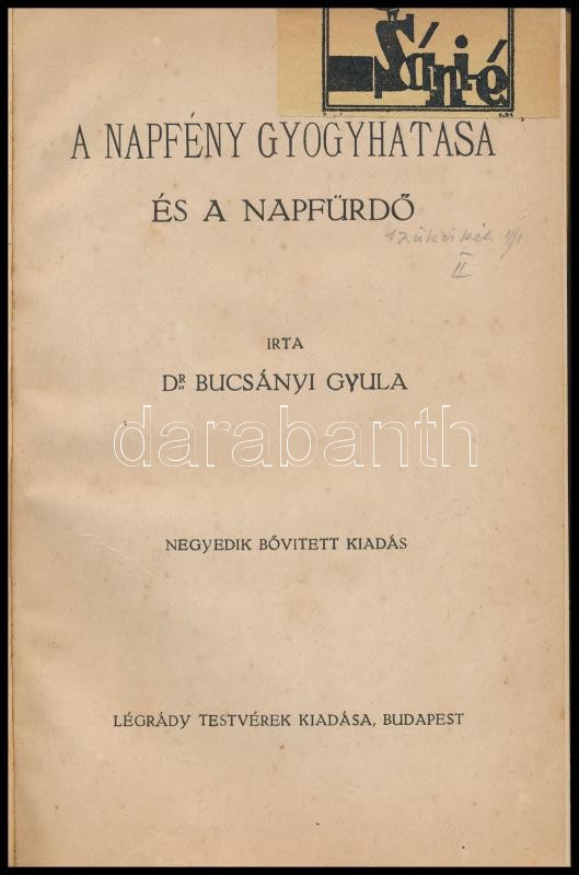 Bucsányi Gyula: Napfürdőzés és a napfény gyógyhatása. Bp., én., Légrády. Negyedik kiadás. Átkötött egészvászon-kötés, két ex-libris-szel, közte az egyik Sinkó Károly (1910-1967): Ex libris Budinszky Sándor, klisé, papír, jelzett (Sinkó K. 1932.), 8,5x6 cm