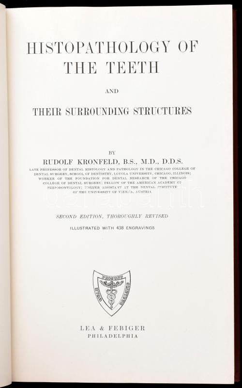 Kronfeld, Rudolf: Histopathology of the Teeth and Their Surrounding Structures. Philadelphia, 1943, Lea & Febiger, 504 p. Második kiadás. Számos fekete-fehér képpel illusztrálva. Angol nyelven. Kiadói aranyozott gerincű egészvászon-kötés, jó állapotban.