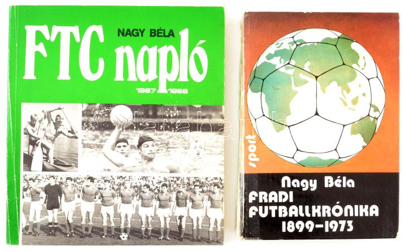2 db FTC-Fradi témájú könyv: Nagy Béla: Fradi futballkrónika 1899-1973. Bp., 1974, Sport. Kiadói kartonált papírkötés, sérült, ragasztott gerinccel. + FTC napló 1967-1968. Bp., 1983, Mezőgazdasági Kiadó. Fekete-fehér fotókkal illusztrált. Kiadói papírkötés, a borítón kisebb törés- és ázásnyomokkal.