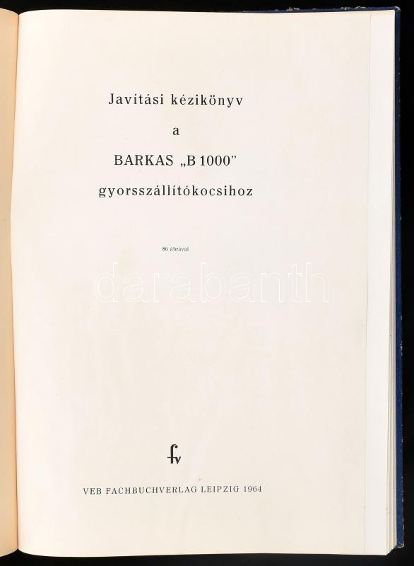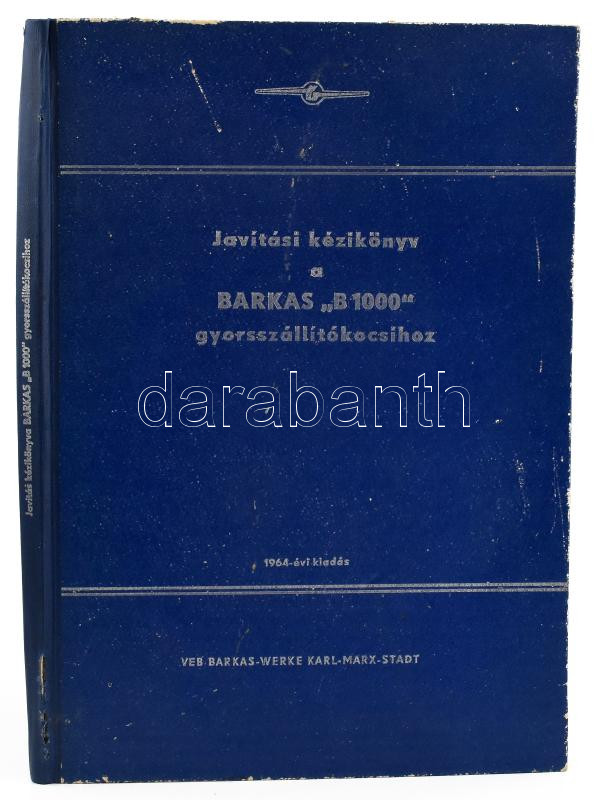 Javítási kézikönyv a Barkas "B1000" gyorsszállítókocsihoz. Ford.: Virágh Iván. Leipzig, 1964, VEB Fachbuchverlag. Rengeteg fekete-fehér képpel, műszaki ábrákkal illusztrálva (közte kihajtható is). Kiadói félvászon-kötés, kissé sérült borítóval
