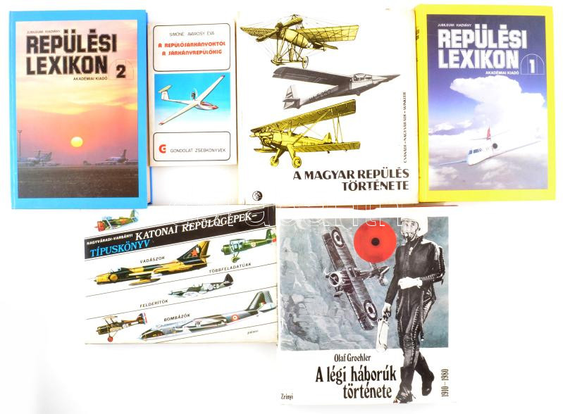 Vegyes repüléssel kapcsolatos tétel, 5 db: Repülési lexikon 1-2. Szerk.: Szabó József. Budapest, 1991, Akadémiai Kiadó. Kiadói kartonált papírkötés.; Olaf Groehler: A légi háborúk története. 1910-1980. Ford.: Nádai Gyula. Bp., 1983, Zrínyi. Második, átdolgozott és bővített kiadás. Kiadói egészvászon-kötésben, kiadói papír védőborítóban.; Nagyváradi Sándor-Varsányi Ernő: Katonai repülőgépek típuskönyv. Bp., 1976., Zrínyi. Kiadói egészvászon-kötés, kiadói papír védőborítóval.; Csanádi Norbert-Nagyváradi Sándor-Winkler László: A magyar repülés története. Bp.,1974., Műszaki. Első kiadás. Kiadói kartonált papírkötés, a gerincén kis sérüléssel. Simóné Avarosy Éva: A repülősárkányoktól a sárkányrepülőkig. Gondolat Zsebkönyvek. Bp., 1981., Gondolat. Kiadói papírkötés.