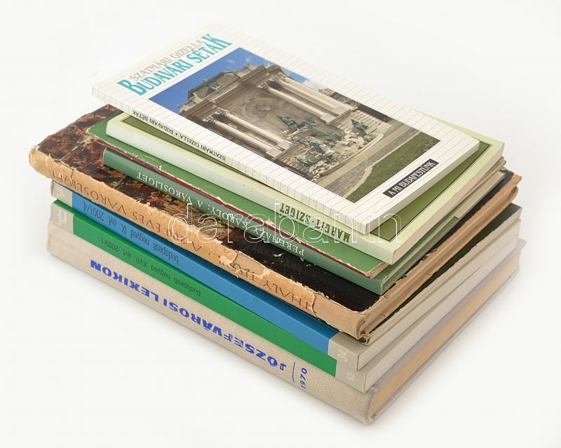 10 db Budapest helytörténeti könyv: Budavári séták; Margit-sziget; Műemlékeink - Margitsziget, Nagytétény műemlékei; A Városliget; A 200 éves Városliget; A budavári gótikus szoborlelet; Budapesti Negyed 2 db száma; Józsefvárosi lexikon. Vegyes állapotban.