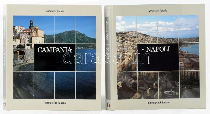 Attraverso l'Italia, 2 kötet: Napoli; Campania. H.n., 1985-1989, Touring Club Italiano. Rendkívül gazdag képanyaggal illusztrálva, Domenico "Mimmo" Jodice fotóival. Olasz nyelven. Kiadói kartonált papírkötés, kiadói papír védőborítóban, kiadói kartontokban.