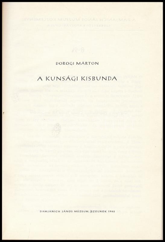 Dorogi Márton: A kunsági kisbunda. A Damjanich János Múzeum Közleményei 8-9. Szolnok, 1962, Damjanich János Múzeum. Átkötött egészvászon-kötésben, az eredeti elülső papírborító bekötve. Megjelent 2000 példányban. A szerző által DEDIKÁLT példány.