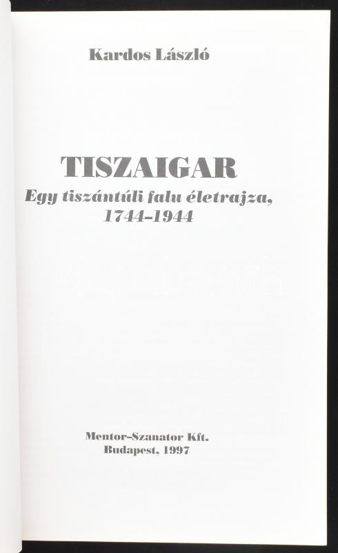 https://www.darabanth.com/en/429-Online-auction/429.0/Books/Books-Travelling-Local-History~1000012/Kardos-Laszlo-Tiszaigar-Egy-falu-eletrajza-1744-1944-Bp-1997-Mentor-Szanator-Kiadoi-pap~II2725015