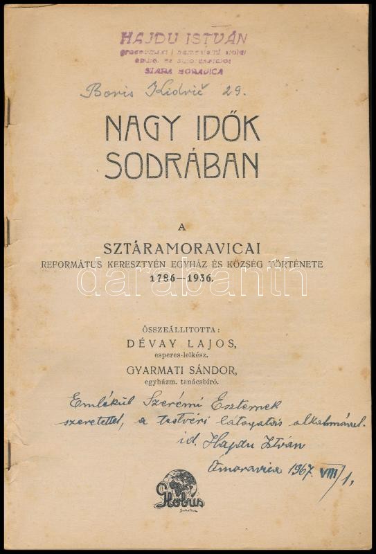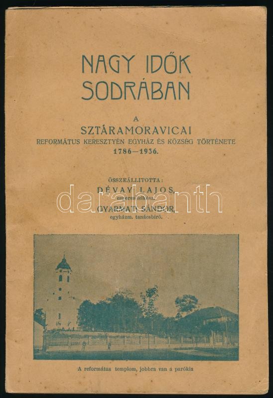 Nagy idők sodrában. A sztáramoravicai református keresztyén egyház és község története 1786-1936. Összeáll.: Dévay Lajos, Gyarmati Sándor. Subotica/Szabadka,(1936), Globus-ny., 124+2 p. (Bácskossuthfalva/ Ómoravica/ Stara Moravica.) Kiadói papírkötés, kissé foltos borítóval, névbélyegzővel, névbejegyzéssel, ajándékozási sorokkal. Ritka!