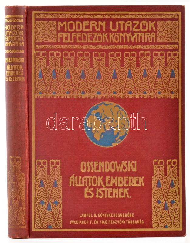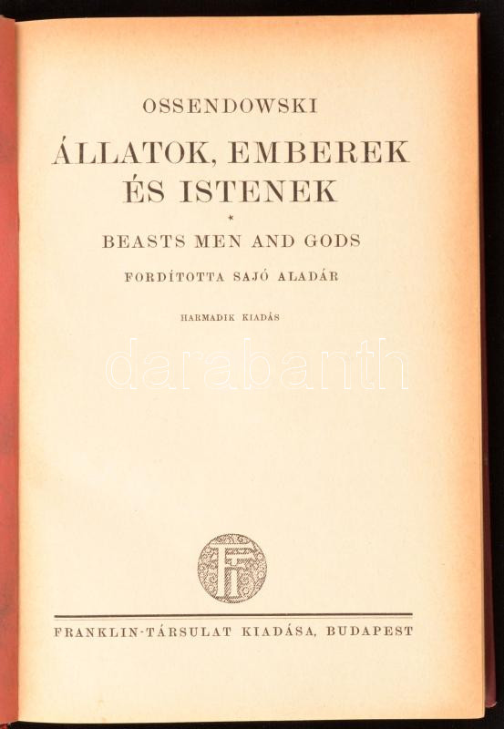 [Ossendowski, Ferdynand Antoni (1876-1945)]: Ossendowski: Állatok, emberek és istenek. Beasts men and gods. Ford.: Sajó Aladár. Modern Utazók Felfedezők Könyvtára. Bp.,[1924], Franklin, 240 p. Harmadik kiadás. Kiadói dúsan aranyozott egészvászon sorozat-kötés, egészen apró kopásnyomokkal, térkép nélkül, egyébként jó állapotban.