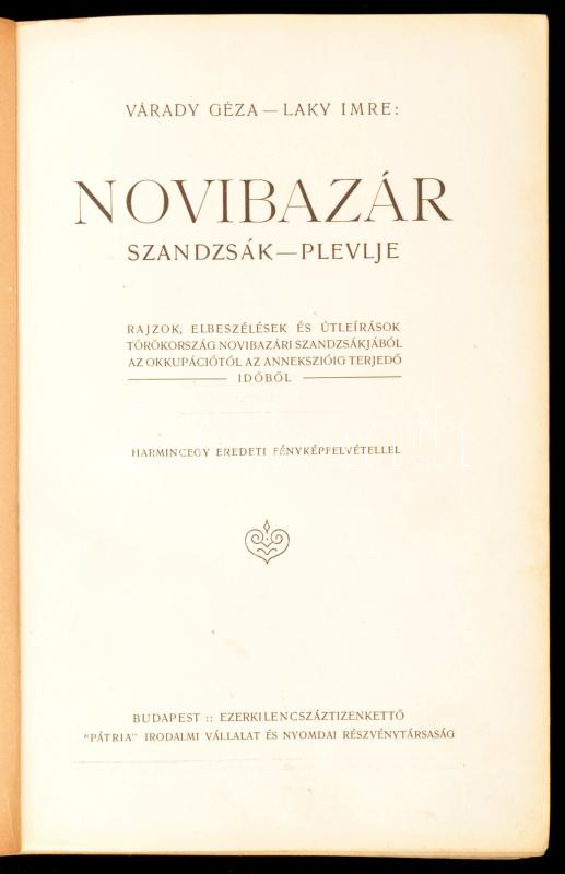 Várady Géza-Laky Imre: Novibazár. Szandzsák-Plevlje. Rajzok, elbeszélések és útleírások Törökország novibazári szandzsákjából az okkupációtól az annekszióig terjedő időből. Bp., 1912., "Pátria", 270+1 p. Gazdag fekete-fehér képanyaggal illusztrált. Kiadói festett, illusztrált egészvászon-kötés, kopott, foltos borítóval, a gerincen kis sérülésnyommal, laza fűzéssel, hiányzó hátsó szennylappal.