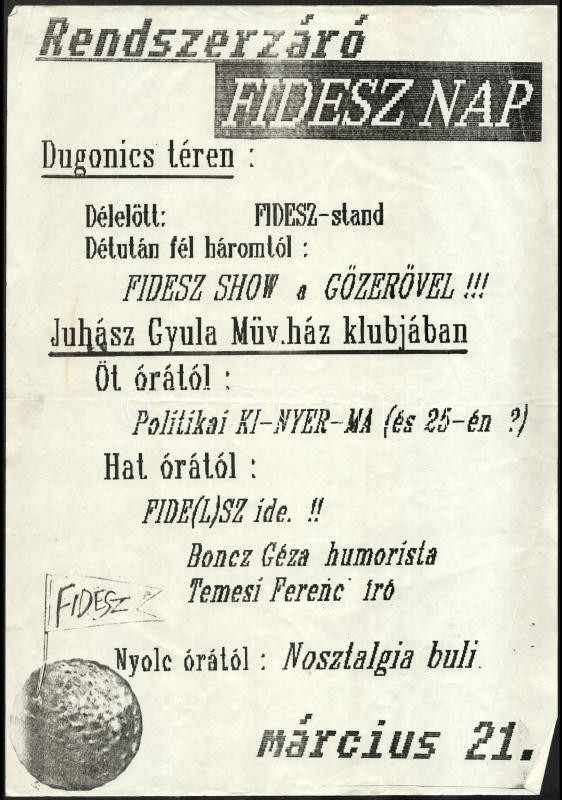 1990 Rendszerzáró FIDESZ Nap, március 21., plakát, hajtásnyomokkal, 42x29 cm