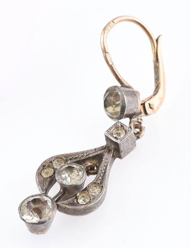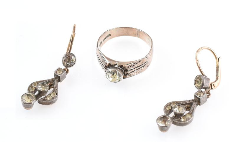 Arany (Au/9k) strassz köves antik ékszer szett, 3 db-os, gyűrű és fülbevalópár. Jelzett, össz. bruttó: 6,8 g, gyűrű m: 51. Eredeti, korának megfelelő állapotú dobozban.