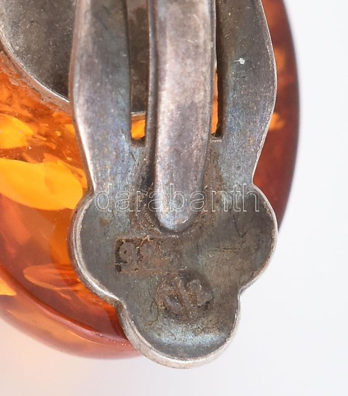 Ezüst (Ag) és borostyán szett, 3 db-os, gyűrű + klipszes fülbevalópár. Jelzett, össz. bruttó: 8,3 g, gyűrű m: 58